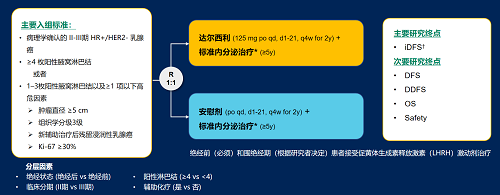 达尔西利(Dalpiciclib)是PA视讯医药自主研发的口服、选择性的小分子CDK4/6抑制剂,也是中国首个自主研发的新型高选择性 CDK4/6 抑制剂,已证实其与内分泌治疗(ET)联合用于 HR+/HER2- 晚期乳腺癌的一线和后线治疗时,均显著改善无进展生存期(PFS)6,7。因此开展了一项随机、双盲、III期临床试验(DAWNA-A),以进一步评估达尔西利联合内分泌治疗作为高危早期 HR+/HER2 - 乳腺癌辅助治疗的效果。本研究纳入高危复发风险人群需满足以下标准之一:①≥4 枚阳性腋窝淋巴结;②1–3枚阳性腋窝淋巴结且合并≥1 项高危因素(肿瘤直径 ≥5 cm,组织学分级3级,辅助治疗后残留浸润性乳腺癌,Ki-67 ≥30%)。本文呈现预先设定的首次中期分析(IA1)结果。